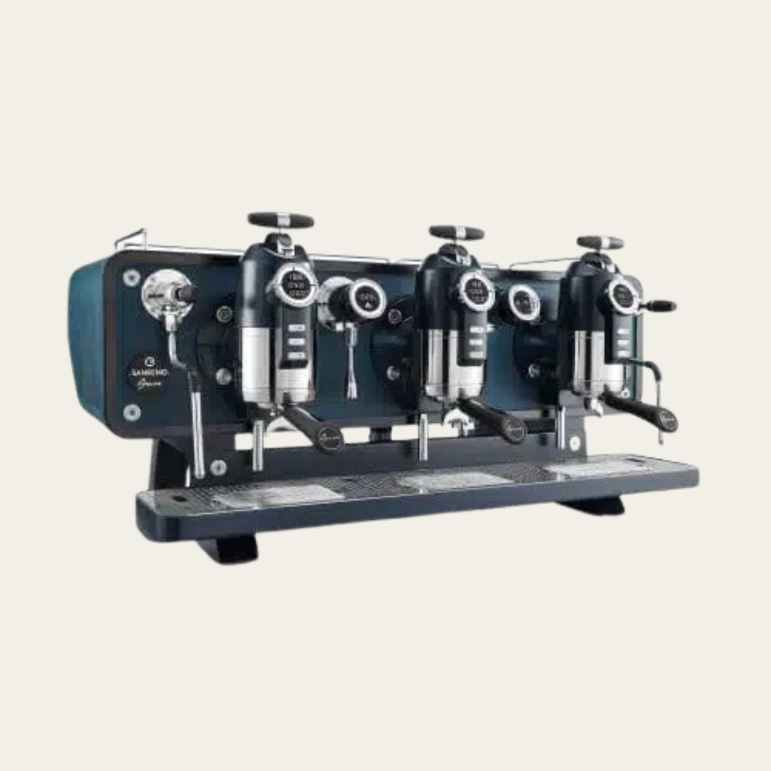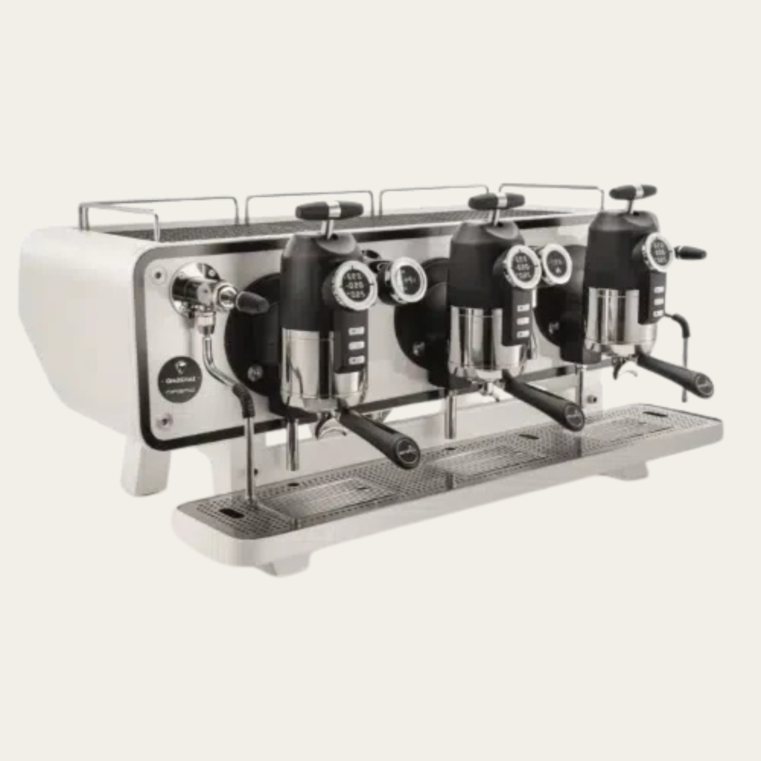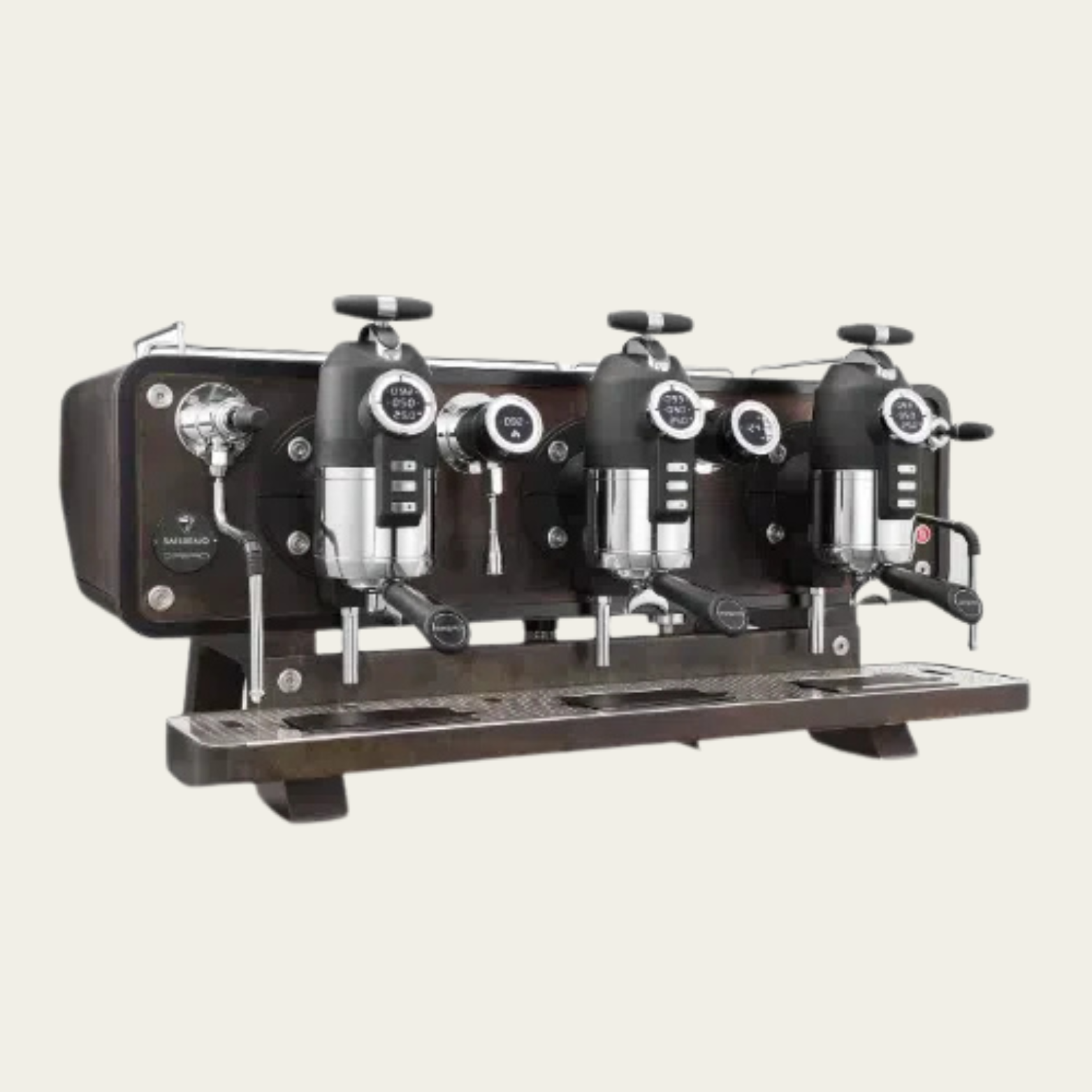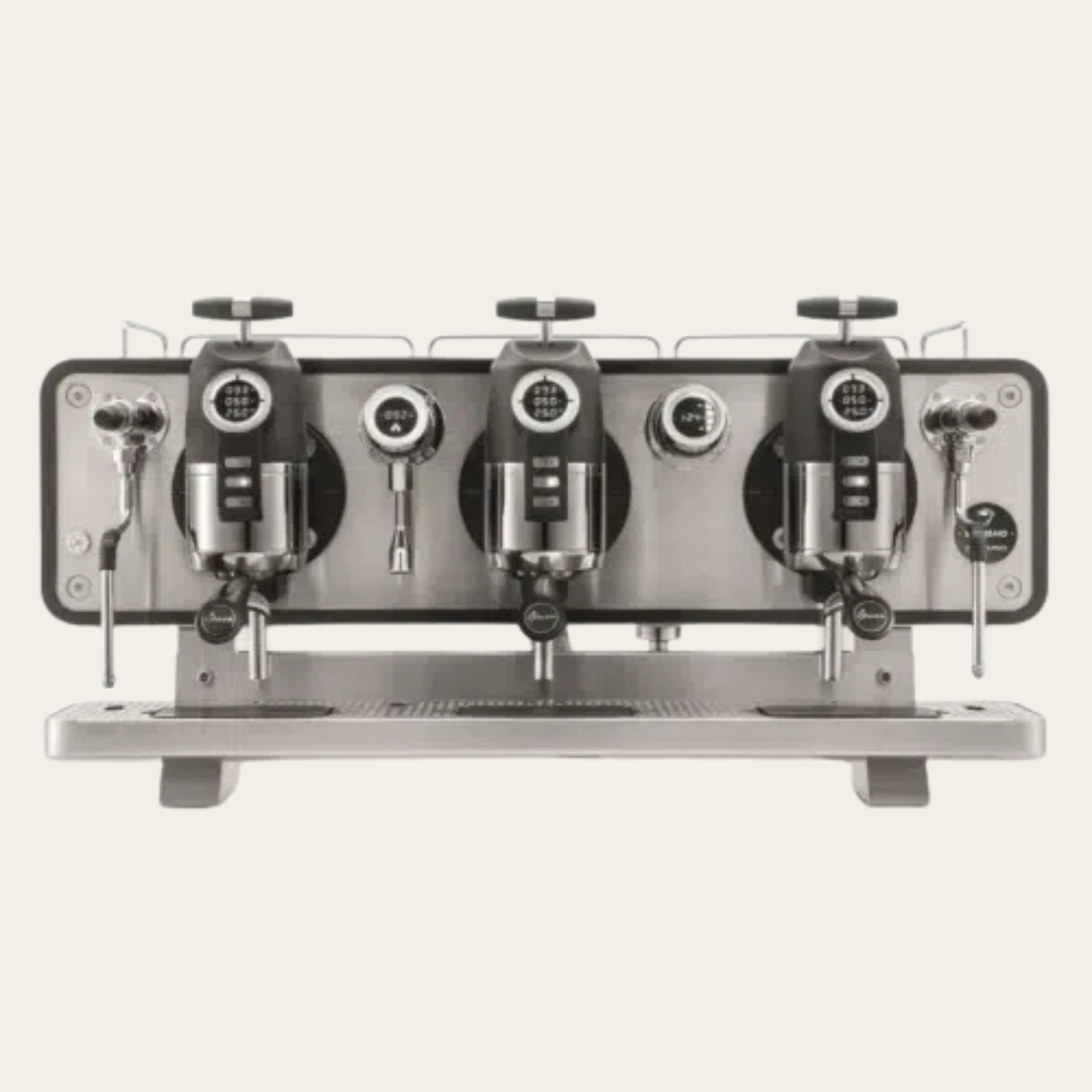 Displays for coffee parameters, infusion water, and steam boiler stats. -